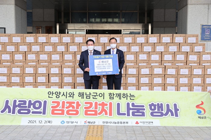 명현관 해남군수는 2일 안양시청에서 최대호 안양시장을 만나 해남 김치 341박스(3,410㎏)을 전달하는 사랑의 김장김치 나눔 행사를 가졌다.
