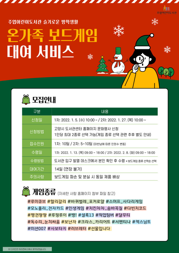 지난해 여름방학에 이어 실시하는 보드게임 대여 서비스‘온가족 보드게임’은 1월 13일과 2월 8일 두 차례 진행된다.