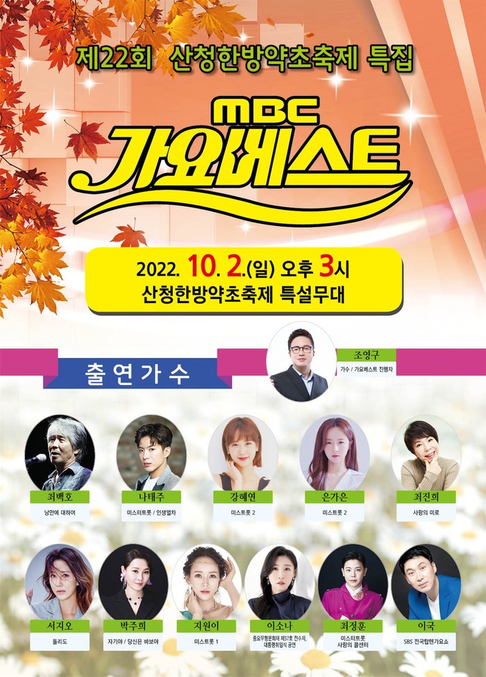 산청군은 내달 2일 추억과 낭만의 ‘MBC 가요베스트’가 제22회 산청한방약초축제 특집으로 열린다고 28일 밝혔다.