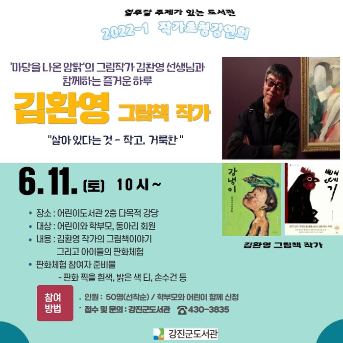 이번 작가초청강연회는 ‘열두달 주제가 있는 도서관’ 프로그램의 일환으로 6월의 평화와 관련된 김환영 작가의 그림책을 중심으로 ‘살아있다는 것-작고, 거룩한’을 주제로 진행된다.