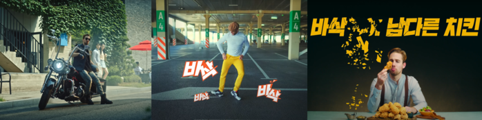 가장 먼저 공개된 ‘바이크편’은 도심 한복판에 세워진 바이크의 페달을 밟는 순간 바삭 소리가 들려오며 주변의 시선을 끄는 모습이 이색적인 재미를 선사한다. ‘댄스편’은 흥겨운 리듬에 몸을 맡기며 스텝을 밟을 때마다 바삭 소리가 신선하게 다가온다. 마지막 ‘ASMR편’은 고요한 분위기 속 치킨을 한입 씹을 때마다 전해지는 바삭소리와 함께 상단에 위치한 글자들이 하나씩 부숴지는 모습이 인상 깊다.