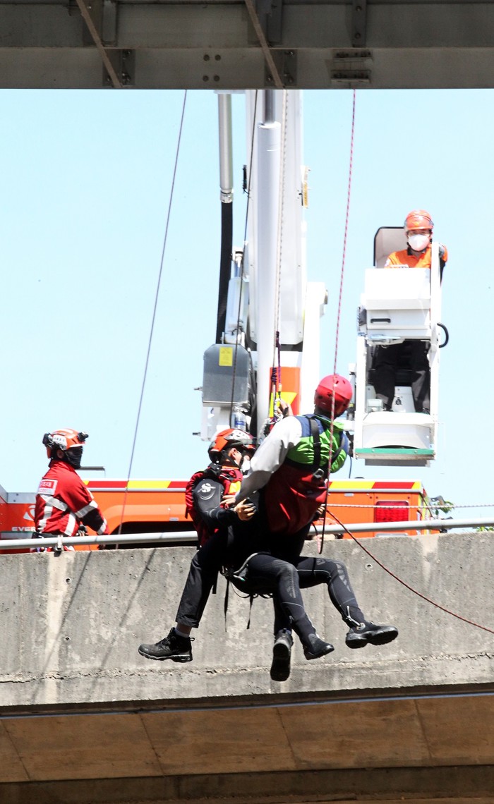 | ▲ 동작구와 동작소방서가 협업해 도림천 고립자를 구조하는 훈련을 진행하고 있다.(사진제공=동작구청) |