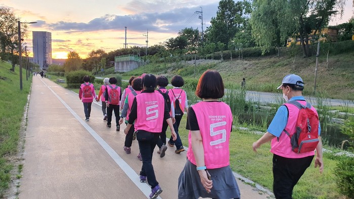 | ▲ 건강동아리 회원들이 건강을 위해 산책로를 함께 걷고 있다. (사진제공=강동구청) |