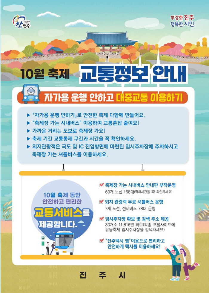 진주시는 오는 5일부터 20일까지 16일간 개최되는 진주시 10월 축제장에 관람객들이 안전하고 편리하게 방문할 수 있도록 맞춤형 교통서비스를 제공한다.