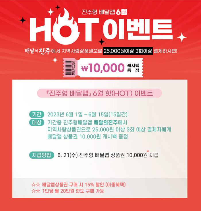 지난 5월 1일 발행한 진주형 배달앱 전용 상품권은 15% 할인된 가격으로 개인당 월 20만 원 한도 내에서 구매 가능하다.