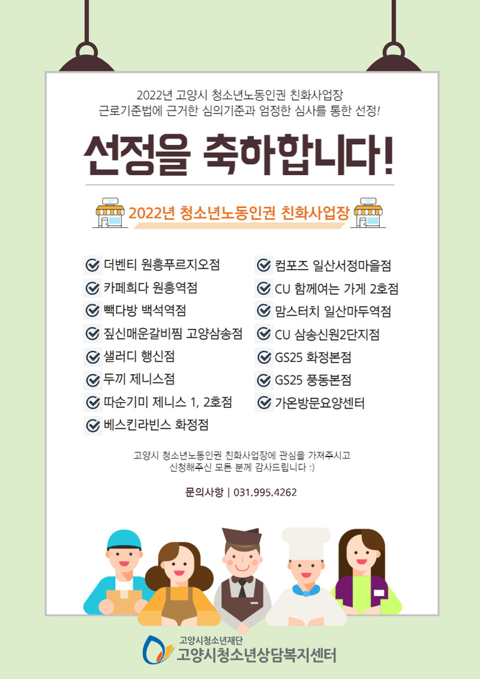 [고양=이기홍 기자] 재단법인 고양시청소년재단 산하기관 고양시청소년상담복지센터(센터장 황상하)는 고양시 청소년 노동인권 보호 및 증진 조례에 따라 청소년의 노동인권 보호 및 개선할 사업장 15곳을 선정하고 청소년노동인권 친화사업장 지원에 나선다.
