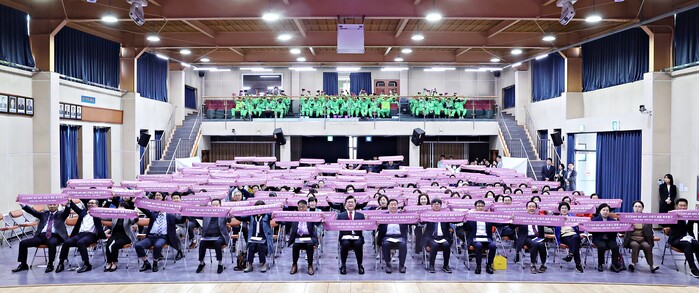 | ▲ 2023년 10월 열린 미추홀구 자원순환 비전 선포식에 참석한 이영훈 구청장(앞줄 가운데) 및 참서가들이 ‘쓰레기 제로 미추홀구’라는 문구가 적힌 플래카드를 들고 있다. (사진=미추홀구청 제공) |