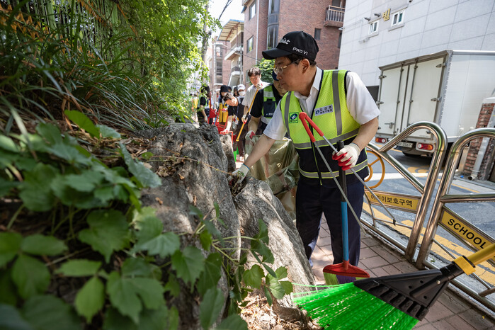 | ▲ 김 구청장이 화양초등학교 일대에서 청소를 하고 있다.(사진=광진구청 제공) |