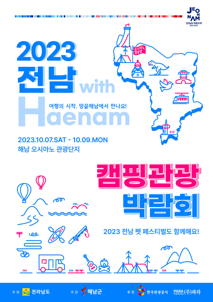 [남악=황승순 기자] 전남도와 해남군은 ‘2023년 전남 캠핑관광 박람회’를 오는 10월7일부터 3일간 해남군 오시아노 오토캠핑장에서 개최한다고 밝혔다.