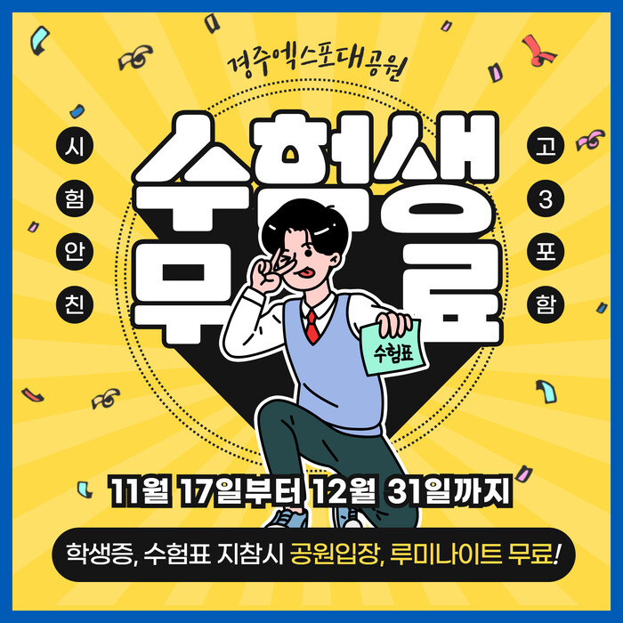 [경주=박병상 기자] 경상북도문화관광공사(사장 김성조) 경주엑스포대공원은 2024학년도 대학수학능력시험을 앞두고 수험생 무료입장 이벤트를 실시한다고 밝혔다.