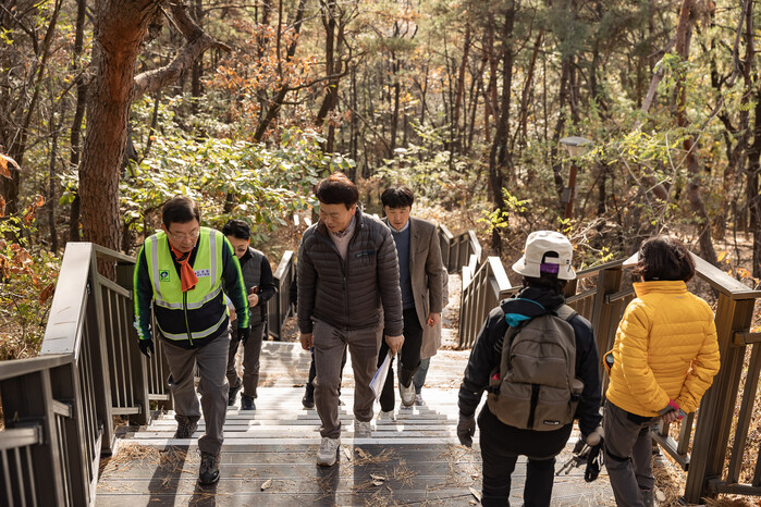 | ▲ 김경호 구청장이 관계자들과 아차산을 점검하고 있다. (사진=광진구청 제공) |