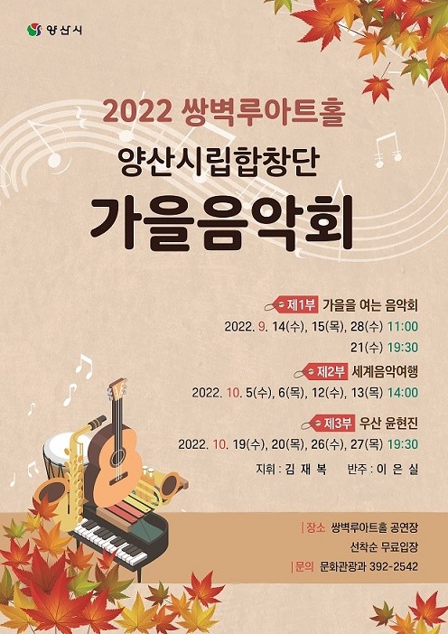 [양산=최성일 기자] 양산시립 합창단은 오는 14일부터 10월27일까지 쌍벽루아트홀 공연장에서 가을 음악회를 개최한다.