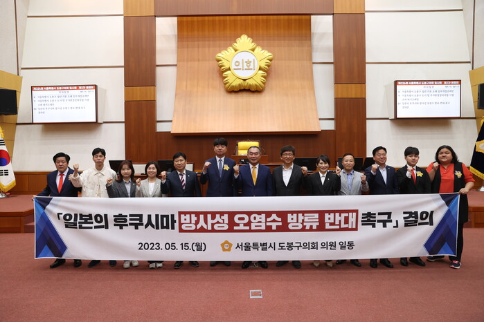 | ▲ '일본의 후쿠시마 방사성 오염수 방류 반대 촉구 결의안'을 채택한 도봉구의원들이 기념촬영을 하고 있다. (사진=도봉구의회 제공) |