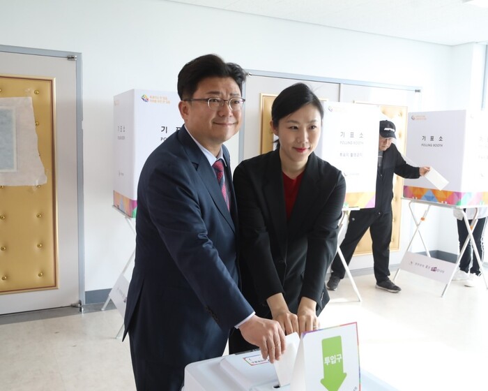 [구미=박병상 기자] 경북 구미시 국민의힘 강명구 구미(을) 국회의원 후보는 제22대 국회의원 선거 사전투표 첫날인 5일 오전 9시 구미시 강동청소년문화의집을 찾아 부부 동반 사전투표를 했다.