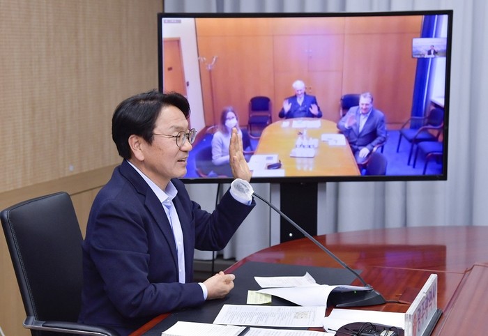 | ▲ 강기정 광주광역시장이 지난 5일 오후 시청 영상회의실에서 프랑스 앙기엥레뱅 필리페 쉬에르 시장과 화상을 통해 인사를 나누고 있다./광주광역시 제공 |