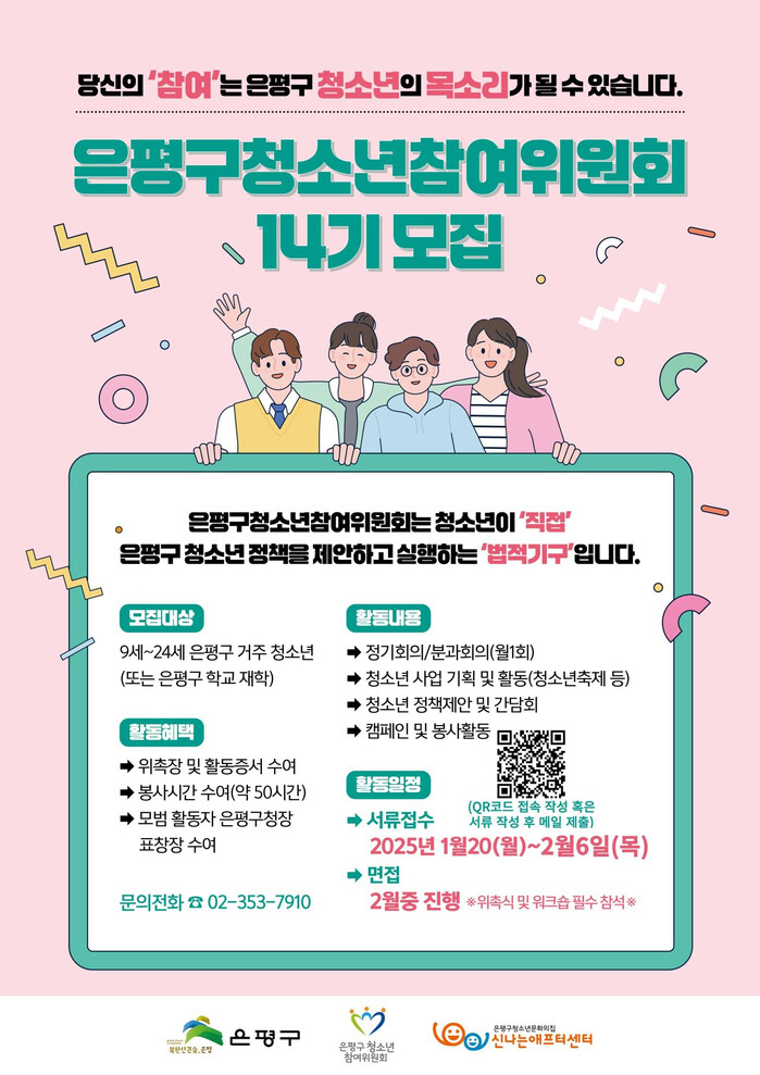 ‘제14기 은평구 청소년위원회’ 위원은 학교추천과 공개모집을 통해 30명으로 구성될 예정이다. 은평구에 거주하거나 은평구에 소재한 학교에 재학 중인 9세부터 24세 청소년이면 누구나 신청할 수 있다.