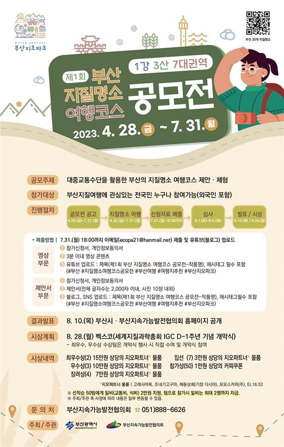 이근희 부산시 환경물정책실장은 “이번 공모전이 부산의 도시 인프라를 이용한 뛰어난 접근성과 자연경관·지질유산·탐방로 등을 두루 갖춘 도시형 지질공원의 매력을 널리 알릴 수 있는 계기가 될 것”이라고 전했다.