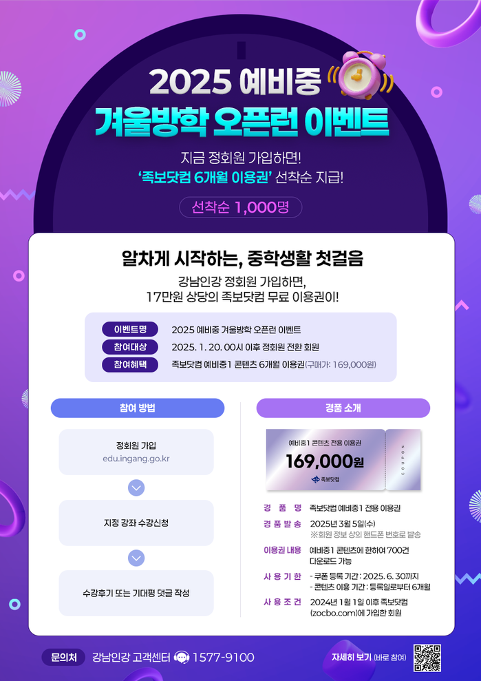 [시민일보 = 이대우 기자] 강남구(구청장 조성명)가 운영하는 온라인 교육 플랫폼 강남인강이 오는 20일~2월28일 예비 중학생 1000명을 대상으로 족보닷컴 6개월 이용권(16만9000원 상당)을 무료로 제공하는 ‘2025 예비중 겨울방학 오픈런 이벤트’를 진행한다.