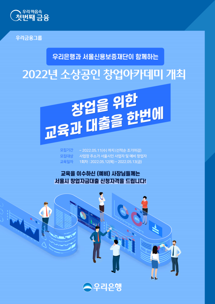 ‘우리은행과 서울신용보증재단이 함께하는 소상공인 창업아카데미’는 우리WON뱅킹·인터넷뱅킹·모바일웹에 접속해 오는 11일까지 참가 신청이 가능하며, 선착순 모집으로 조기마감될 수 있다.