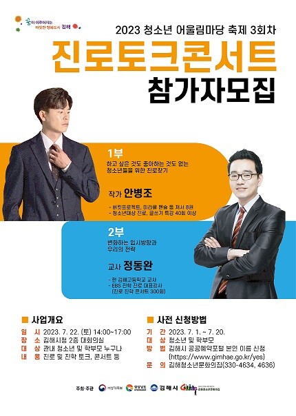 한미정 김해청소년문화의집 관장(시, 아동청소년과장)은 “최근 입시와 관련한 논란으로 걱정이 많은 상황에서 청소년들이 우리의 삶의 방향을 어떻게 설정하여 진로를 정하고 구체적인 진학방법으로 접근해야 하는지 해법을 찾는 시간이 되기를 바란다.”고 전했다.