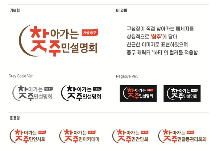 찾아가는 주민 설명회 BI 기본형 디자인은 구청장이 직접 찾아가는 메시지를 ‘찾주’에 담아 친근한 이미지로 표현했다. 또한 주민인사회, 주민아카데미 등 네 가지 응용형 디자인을 별도로 제작해 설명회 성격에 따라 변경해 사용할 수 있도록 했다. 배경에 따라 컬러버전과 흑백버전 등으로 교체해 BI를 강조할 수도 있다는 게 구의 설명이다.