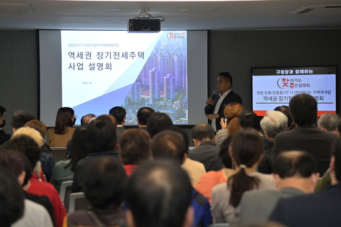 | ▲ 지난 13일 장충동2가 112번지 일대 주택재개발 역세권 장기전세주택 사업 설명회에 참석한 주민들이 설명을 듣고 있다. |