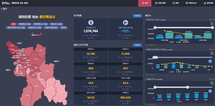 시민들은 용인특례시 빅데이터 플랫폼 대시보드 서비스로 접속하면 인구, 산업/경제, 민원, SNS/뉴스, 용인 지표 등 5개 카테고리에서 관련 데이터를 쉽게 볼 수 있다.