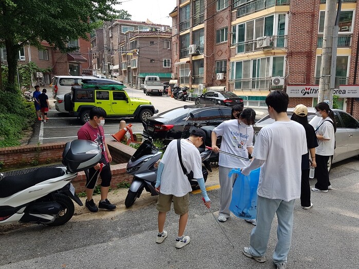 | ▲ 지난해 여름 환경순찰 체험단 학생들이 쓰레기 무단투기 청소 봉사활동을 하고 있다. (사진=강북구청 제공) |