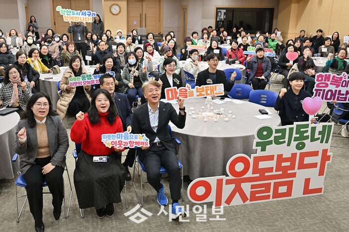 [광주=정찬남 기자] 김이강 광주광역시 서구청장(앞 줄 왼 쪽부터 세 번 쨰)이 22일 서구청 들불홀에서 우리동네 이웃돌봄단 등과 ‘우리동네 이웃돌봄단 활동공유회’ 퍼포먼스를 하고 있다. / 광주 서구 제공