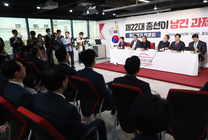 한편 국민의힘은 지난 22일 국회에서 두 번째 당선인 총회를 열고 총선 패배 원인을 분석하는 총선백서 태스크포스(TF)를 구성하며 반성 행보를 지속하고 있다. TF 위원장에는 재선의 조정훈 의원을 임명하고 백서 작성의 전권을 맡겼다. 조 의원은 당에서 지역구 후보로 나선 254명의 모든 후보자에게 설문조사를 진행하는 등 전당대회가 예정된 6월 말까지 백서 작성을 마무리할 계획이다.