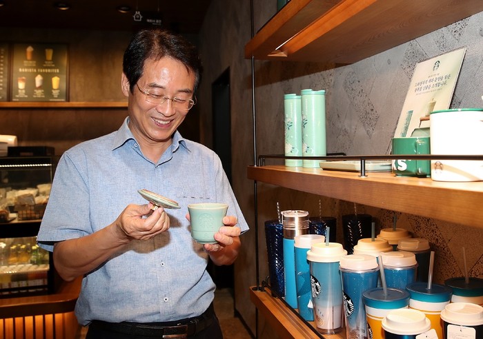 | ▲ 강진원 강진군수가 지난 여름 스터벅스 매장을 방문해 스타벅스와 협업해 출시한 강진청자를 살펴보고 있다. / 사진=강진군 제공 |