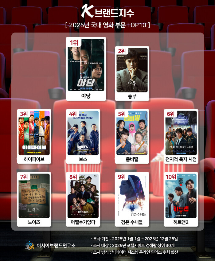 이번 K-브랜드지수 올해의 영화 부문은 2025년 포털사이트 검색량 상위 30개를 대상으로, 2025년 1월 1일부터 12월 25일까지의 온라인 빅데이터 14억 7252만 4614건을 분석해 산출했다.