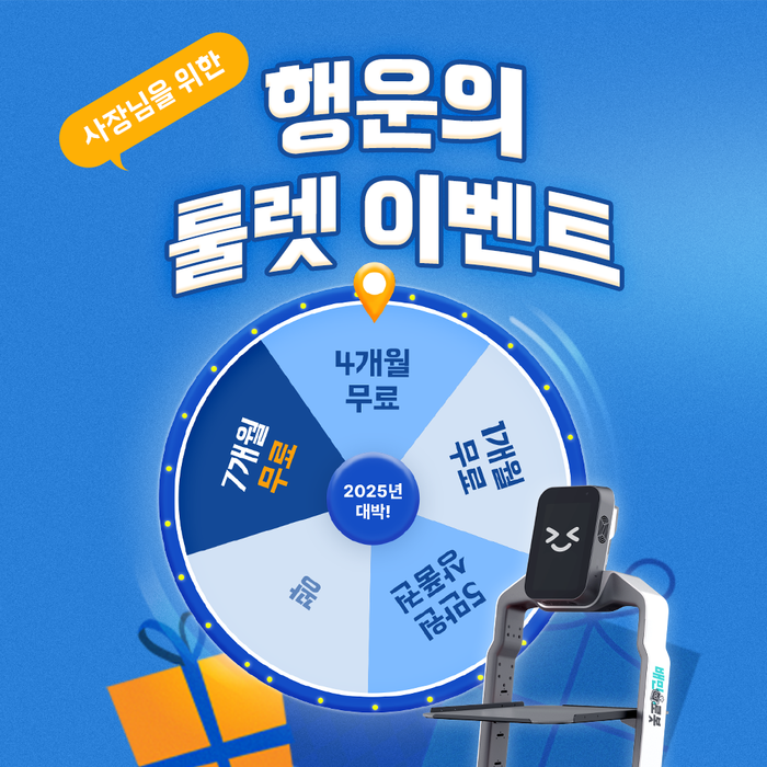 1월 한 달간 진행되는 이번 ‘행운의 룰렛 이벤트’에서는 서빙로봇 납입료 최대 1년 무상 혜택을 제공한다. 더불어 월 8만원대의 안심케어 서비스도 계약기간 동안 무상으로 지원되며, 설치비 면제를 비롯해 서빙로봇 이용을 돕는 20만 원 상당의 웰컴 패키지, 가게 홍보를 위한 10만 원 상당의 로봇 커스텀 홍보물 등 다양한 혜택도 마련했다.