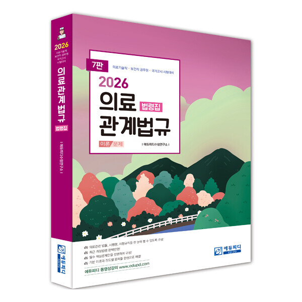 에듀피디가 출간한 ‘2026 의료관계법규 법령집’ 개정 7판은 최신 개정 법령을 완벽하게 반영한 교재로, 개정된 법률과 시행령, 시행규칙을 개정일 및 시행일을 표기해 시험 일자에 맞춰 현행 법령 내용을 정확히 학습할 수 있도록 한 것이 큰 특징이다.