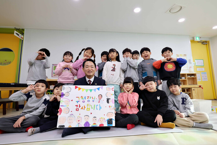 | ▲ 어린이들과 기념촬영을 하고 있는 김찬진 구청장.(사진=인천 동구청 제공) |