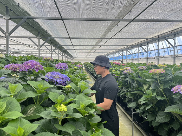 | ▲ 스마트팜 기술을 이용해 수국을 키우고있는 모습. (사진=강진군청 제공) |
