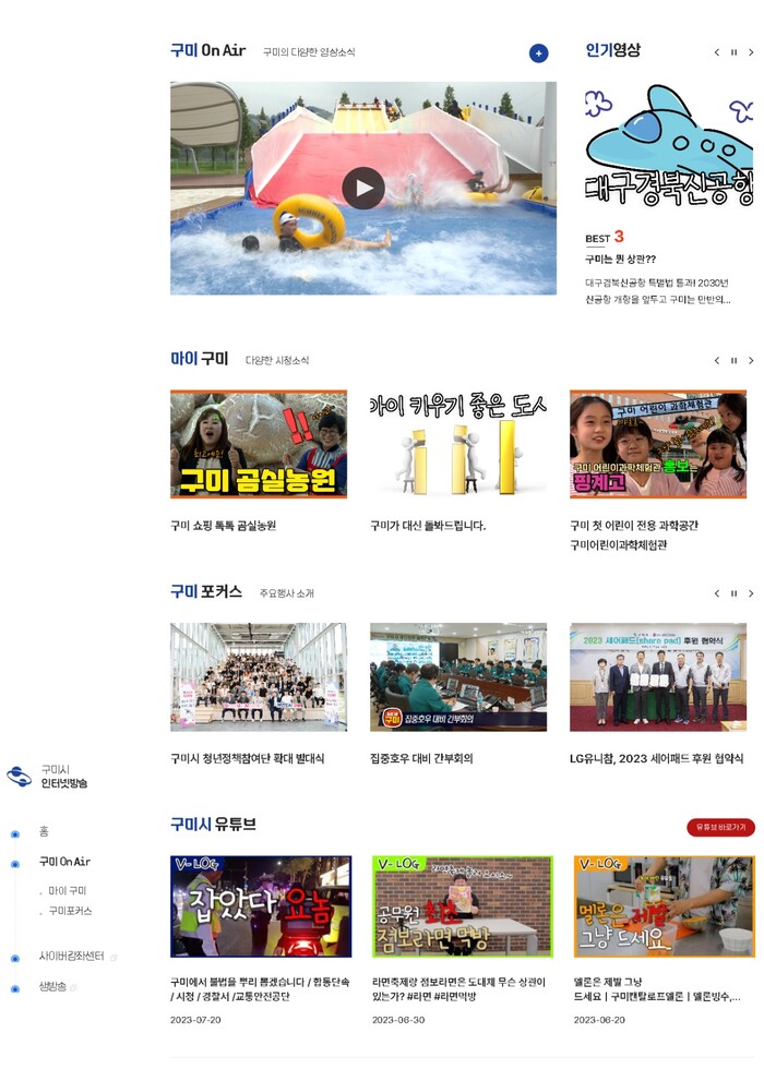 구미시인터넷방송의 홈페이지 내용의 질이 떨어지고 매번 업그레이드되는 영상이 부족하여 인터넷방송의 본질이 사라지고 있어 아나운서가 진행되는 구미시의 시정뉴스의 통합이 절실히 요구된다.