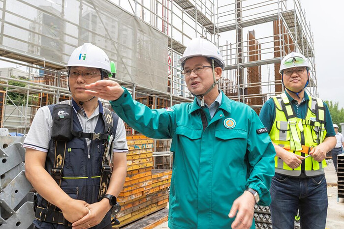 | ▲ 여름철 안전사고 대비 공사현장을 점검하고 있는 최호권 구청장(가운데)의 모습. (사진=영등포구청 제공) |