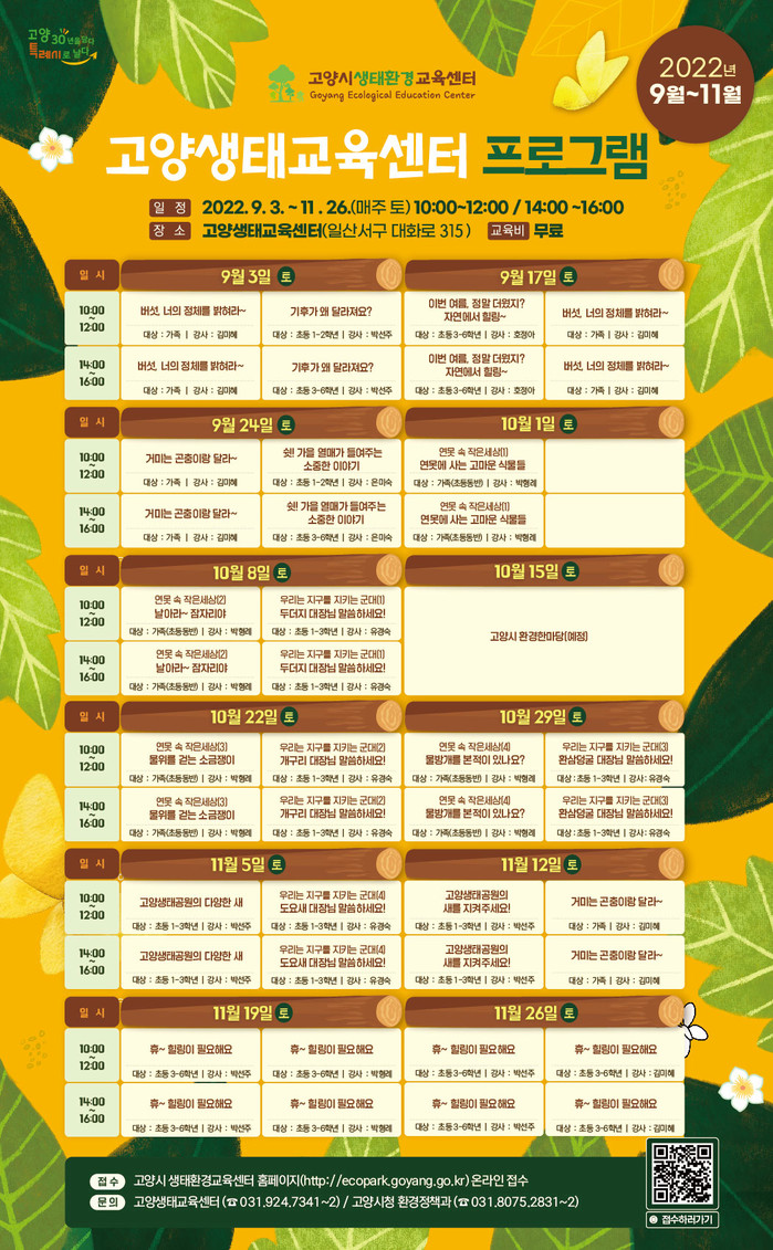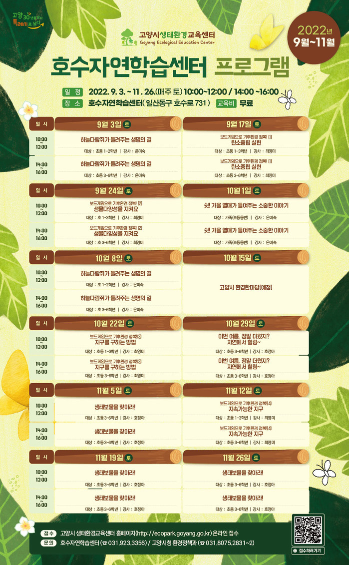 참가 신청과 자세한 내용은 고양시청 환경정책과,고양생태교육센터 또는 호수자연학습센터로 문의하면 된다.