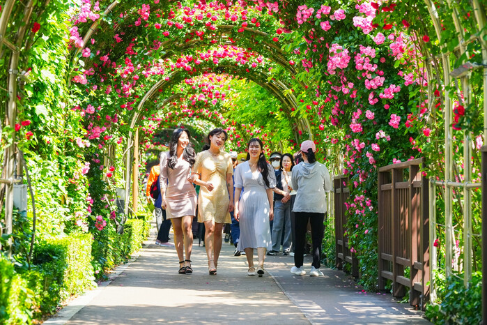 | ▲ 제16회 장미축제를 찾은 시민들이 장미터널을 걷고 있다. |