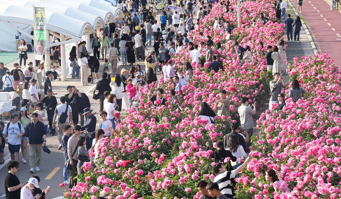 | ▲ 제16회 장미축제를 찾은 시민들이 장미를 살펴보고 있다. |