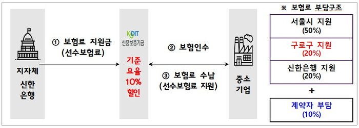 | ▲ 서울시-구로구-신한은행 매출채권보험료 지원 협업 방식. (사진=구로구청 제공) |