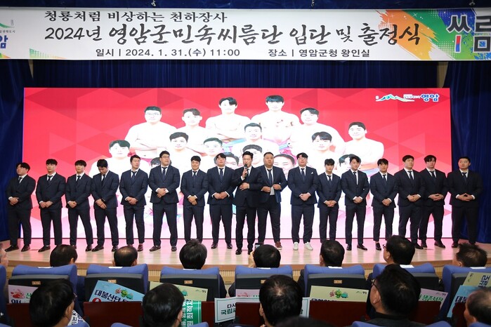[영암=정찬남 기자] 전남 영암군민속씨름단(감독 김기태)이 31일 영암군청에서 300여 영암군민이 참석한 가운데 선수 입단식 및 출정식을 열고, 갑진년 한해 월출산 달빛의 정기로 청룡처럼 비상하겠다는 각오를 전했다.