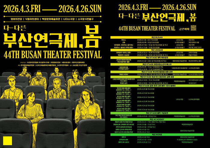 한편 개막식은 4월 3일 영화의전당 하늘연극장에서 열리며, 개막 축하공연으로 2026 대한민국연극제 부산 대표작품 〈품〉(부산연극제작소 동녘)이 무대에 오른다. 폐막식과 시상식은 4월 26일 백양문화예술회관에서 개최된다.