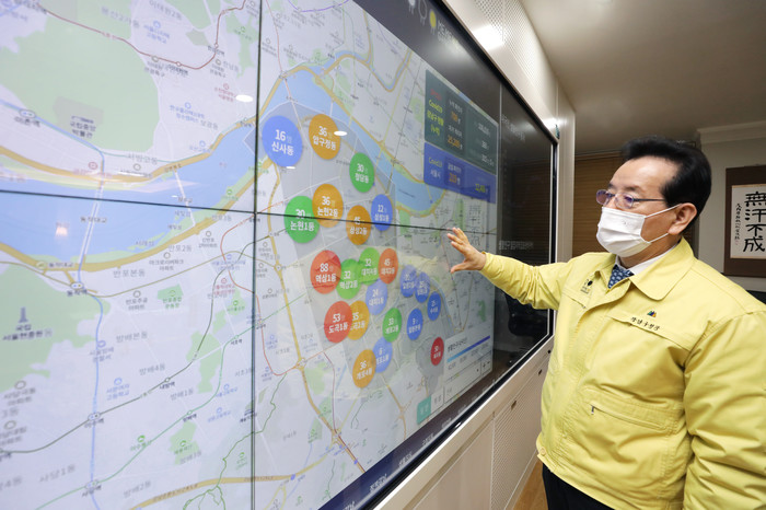 | ▲ 강남구는 ‘스마트강남 구청장실’을 구민을 위한 버전으로 만들어 오픈했다. 사진은 정순균 구청장이 강남 지역 코로나19 누적 확진자 현황을 살펴보고 있는 모습. (사진제공=강남구청) |