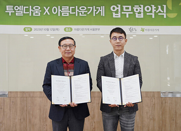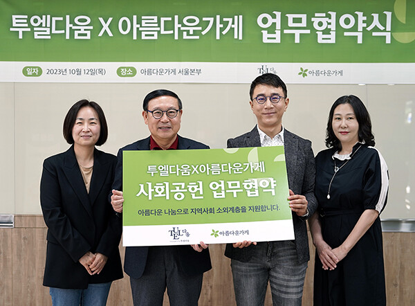 지난 12일 서울 중구 소공로에 위치한 ‘아름다운가게’ 서울본부에서 진행된 협약식에서는 이현석 투엘다움 대표와 장윤경 아름다운가게 상임이사, 임혜선 나눔문화국장이 참석했다.