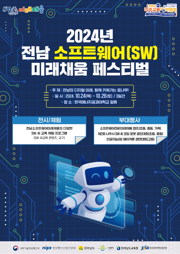 ‘전남의 디지털 미래, 함께 키워가는 꿈나무’를 주제로, 나주시 소프트웨어ㆍ인공지능 코딩 로봇 경진대회, 소프트웨어 미래채움캠프, 소프트웨어ㆍ인공지능 교육 전시 및 체험부스, 미래교육 특강 등 다양한 프로그램이 진행된다.