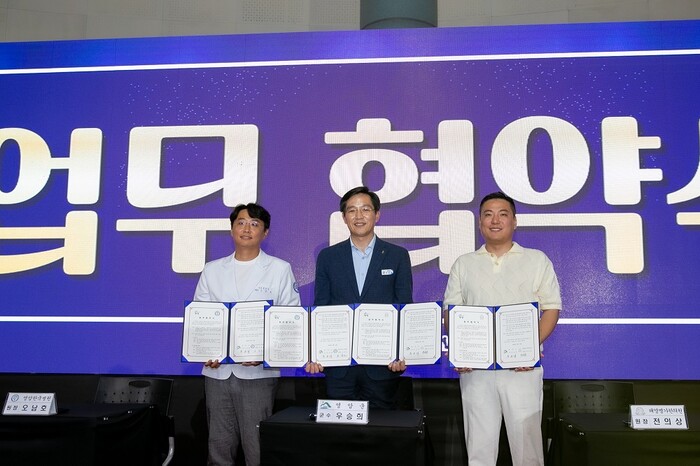 | ▲ 우승희 영암군수(가운데)가 지난 10일 영암읍 국민체육센터에서 오남호 영암한국병원장(왼 쪽), 전의상 태영명가한의원장(오른 쪽)과 영암군민속씨름단의 진료와 건강검진 등 의료지원 지정병원 업무협약을 체결하고 기념촬영을 하고 있다. / 영암군 제공 |