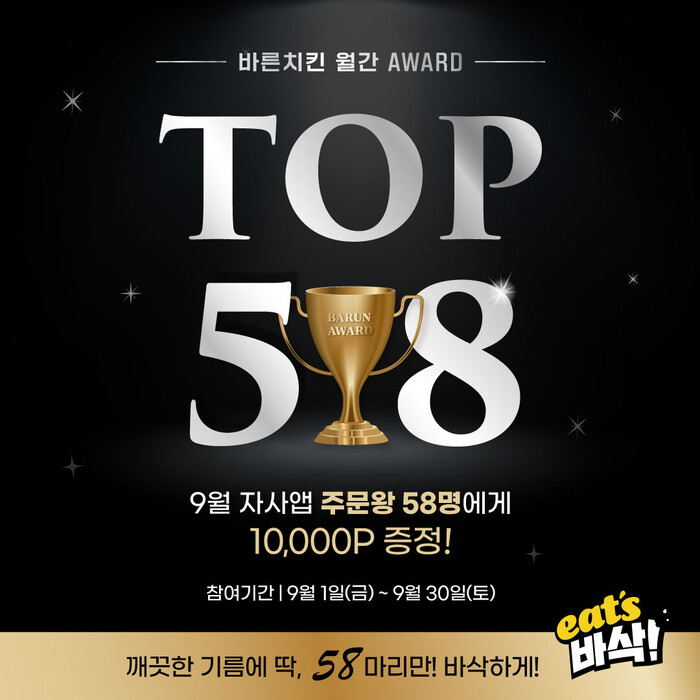 바른치킨이 자사앱 회원을 대상으로 ‘월간 award Top 58’ 주문왕을 뽑는 행사를 정기적으로 이어 나가고 있다.
