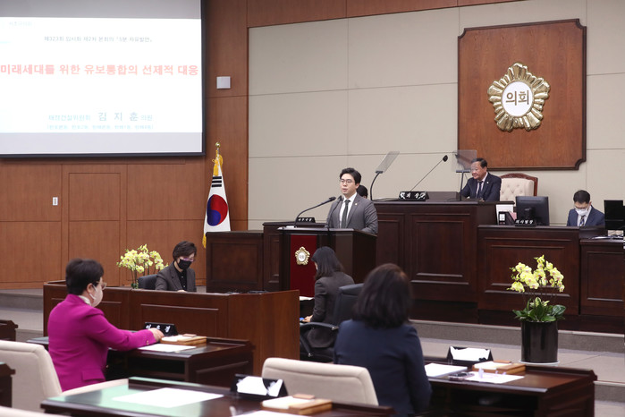 이날 본회의에서는 김지훈 의원의 5분 자유발언과 5개의 조례안 및 동의안 심사가 있었다. 먼저 김지훈 의원은 5분 자유발언을 통해 유치원과 어린이집 간 교육 격차를 언급하며, 유보통합(유치원과 어린이집으로 나뉜 유아교육과 보육 체계의 통합)의 필요성을 강조했다. 아울러 유보통합 추진 과정에서 집행부와 의회가 조례 정비, 관계기관과의 협치 등을 통해 함께 미래세대를 위해 선제적으로 대응해야한다고 말했다.